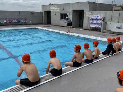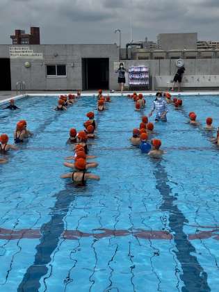 はじめてのバディ、はじめてのシャワー、はじめての水遊び。1年生にとって入学してからはじめてのプールです。先生からプールに入る際の注意を教わった後、ついに入水。