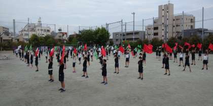 「心を一つに 笑顔の花をさかせよう」とのスローガンのもと、一人技やフラッグの動きを合わせようと頑張っています。