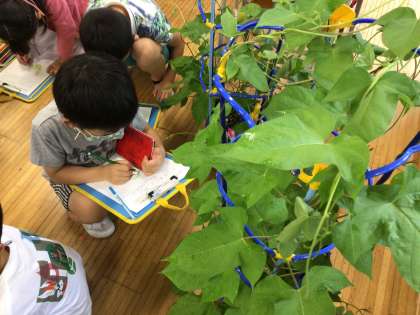 あさがおの観察も5回目となり、慣れてきた様子で、かたち、数、触った感じ、など示された視点に沿ってカードに記録しました。