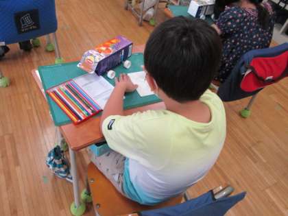 3時間目の途中から4時間目にかけて「走る車」作りをしました。