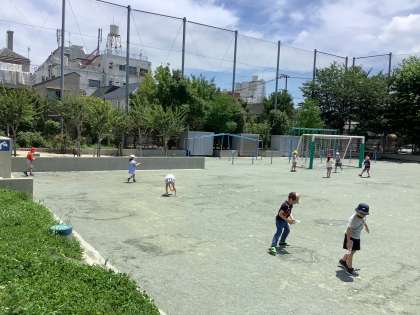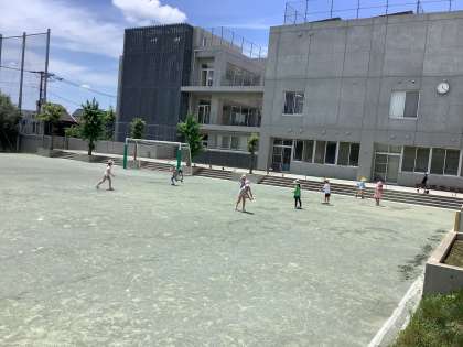 天気が悪く、2クラスが実施できていなかったのですが、今日はまさかの晴天。絶好の水遊び日和でした。無数に噴き出されるシャボン玉と芯や筒の穴から出てくる大きなシャボン玉がおもしろくて、夢中で吹いていました。そして、普段はなかなかできない水を使った地面へのお絵描きや水の飛ばし合い、そして水をかけ合いながらの鬼ごっこは楽しくてもう夢中で取り組みました。担任もずぶ濡れになりながら参加しました。