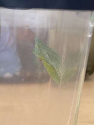 教室に行くと、昨日壁にくっついていた幼虫が蛹になっていました。