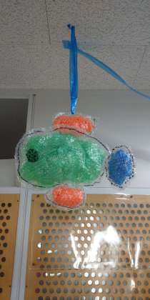 すずらんテープと気泡緩衝材(通称プチプチ)を使って水の中の生き物を作ったようです。