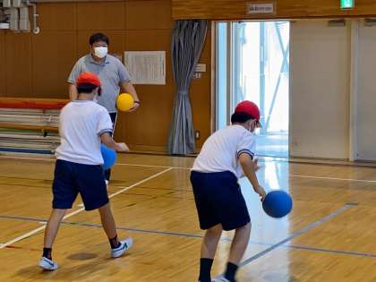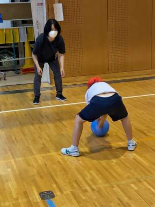 低学年はボールを転がし、キャッチする動き。高学年はボールをついてドリブルする動き。最初はぎこちない動きでしたが、何度も繰り返すうちに慣れてきて、スムーズにボールを扱えるようになってきました。