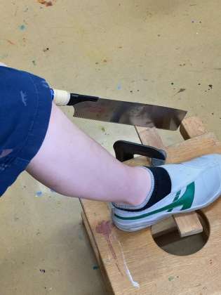 角材を切るところからスタートです。のこぎりの刃と切り方の説明を受け、子供たちは安全に気をつけながら、角材を切っていました。
