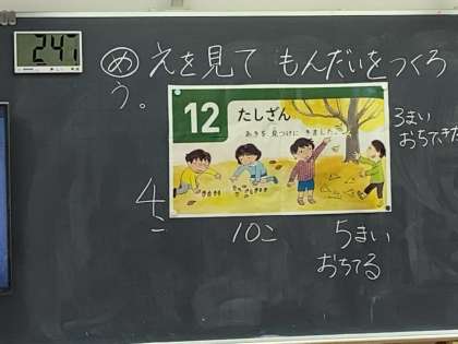 10/18 問題づくり(算数)1年生 公開日 2021/10/18 更新日 2021/10/18 できごと 算数の学習で「問題づくり」をしました。 まずは提示された絵を見て、どんな様子なのかを出し合います。「イチョウの葉が5枚落ちている」「イチョウの葉が木から3枚落ちてきた」これで、問題が作れそうですね。 作った問題をもとにして、子供たちは、図・式・答えを考えていました。 いいね(0)