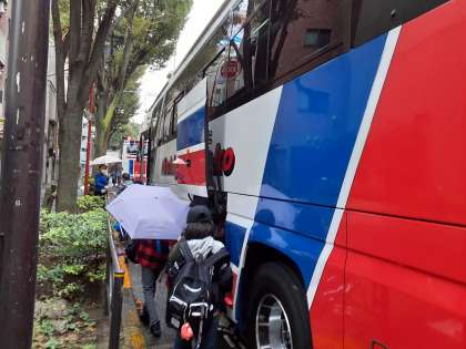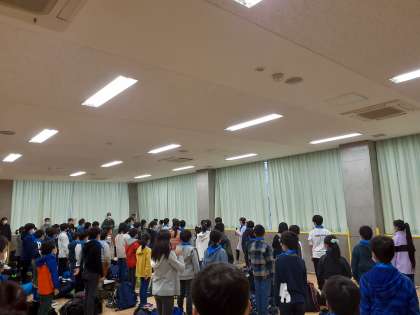 2組、4組、くすのき学級、きはだ学級が小アリーナで出発式を行い、バスで出発しました。