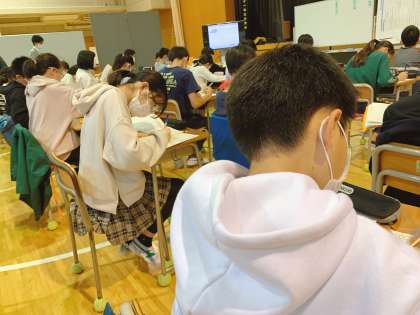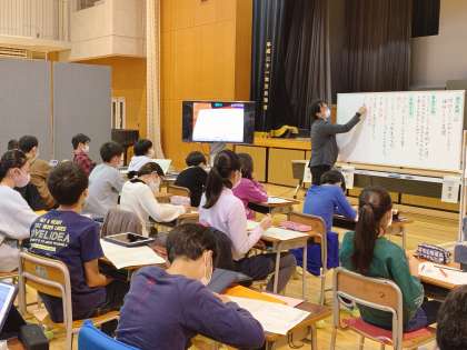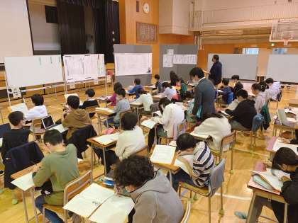 普段とは違う体育館での授業でしたが、タブレット端末を用いて交流し、主体的に学習を進めていました。