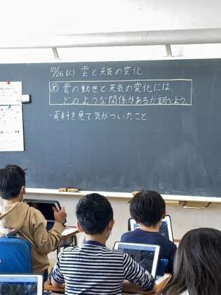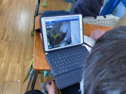 理科「雲と天気の変化」の学習で、雲の動きと天気の変化の関係について調べます。子供たちは気象庁のホームページを開き、日本列島にかかる雲の動きの変化を見ていました。