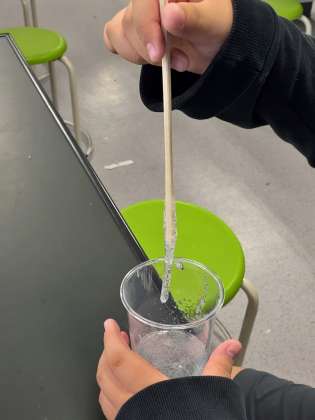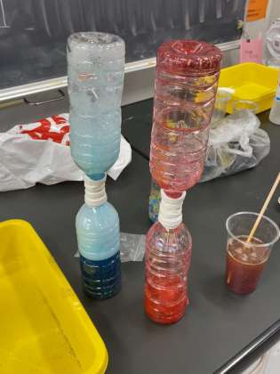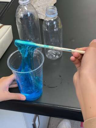 科学クラブでは「スライム時計」をつくりました。2本のペットボトルをつなげ、その中にスライムを入れます。スライムの粘り具合により、スライム時計の時間が変わっていくのです。子供たちはいろいろな色のいろいろな粘り具合のスライム時計をつくっていました。