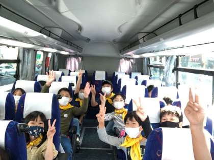 子供たちは、立派なバスに少し緊張気味です。