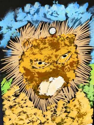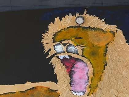 顔の周りに密集して生えいている立髪(たてがみ)は、神のガムテープをちぎって貼っています。ライオンの顔の色や背景の色はスポンジを使って塗りました。