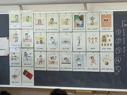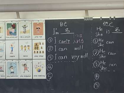 黒板に書かれた文型や単語カードをヒントに自分の名前や得意なことを伝える自己紹介と、自分以外の人のことを伝える他己紹介を考えました。