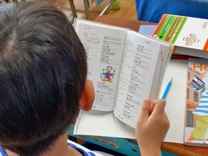 自己紹介の内容は様々ですので、子供たちは分からない単語や文を和英辞典で調べながら、自己紹介・他己紹介の文を考えていました。