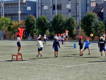 今日はとても天気が良く、子供たちが気持ち良さそうに体育の学習をしています。
