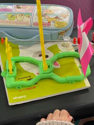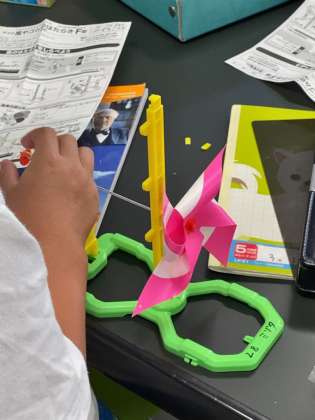まずは実験に向けての準備です。風車を台に取り付け、風の力で自然と回るようにしました。風の強さと物を持ち上げる力の関係を調べるために、風車の軸に糸と輪ゴムを取り付け、物を持ち上げられるようにもしました。どんな実験結果になるのか。楽しみですね。