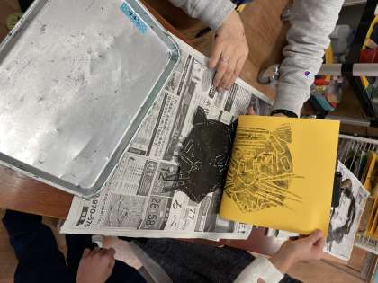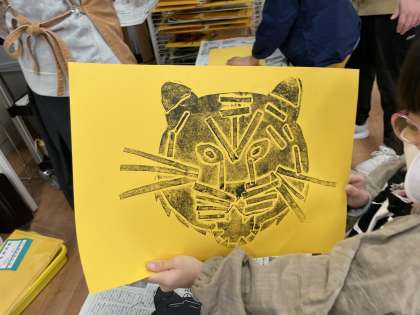 しっかりインクをつけて、「1、2の3!」と画用紙をめくるカッコいいトラの顔が刷り上がりました。トラの表情が一人一人違ってとってもすてきです。