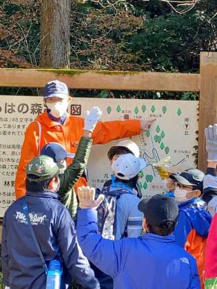 日影沢キャンプ場をスタートして、約1.5キロメートルのコースを歩いて一周するまでの間に、植物や昆虫、生き物等の話を聞いたり、植物の匂いを嗅いだりして、自然を感じながら学習しました。