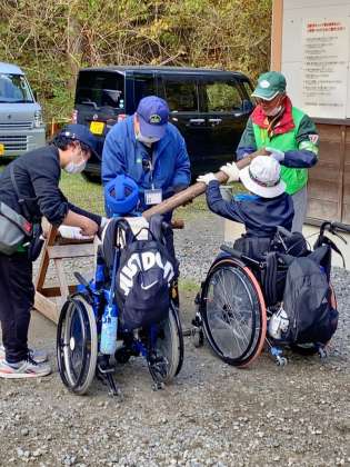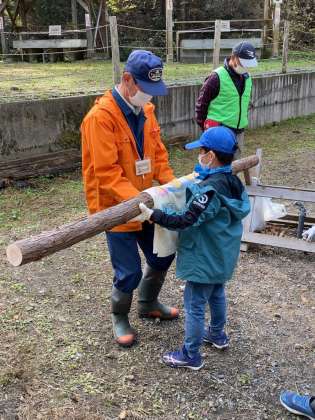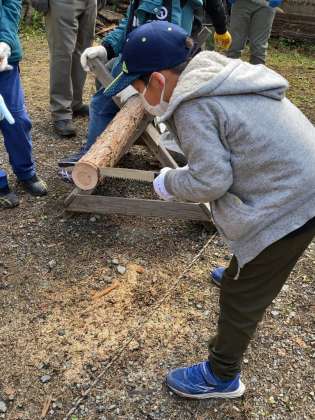 丸太切り体験では、木の重さを確かめました。ずっしりと重く感じたようです。次に、ノコギリを使用して丸太を切りました。