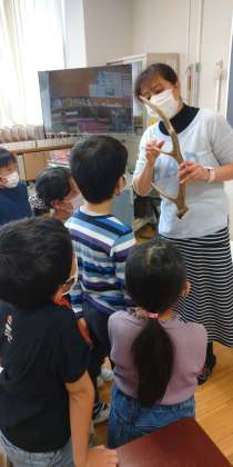 はじめに、本物の鹿の角を触らせてもらって子供たちは大興奮です。
