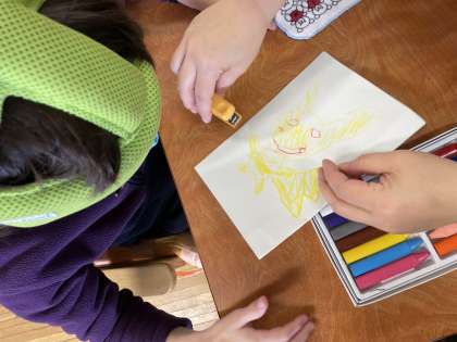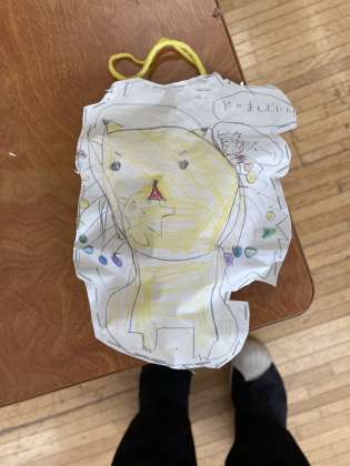 今回の図工で作ったのは「むにゅっち」です。紙に絵を描いて、中にお花紙をつめて、むにゅっとさせます。平面だったものが立体になるとかわいさが倍増します。この「むにゅっち」、実は作るのが結構難しいです。スタプラーやはさみを使ったり、紐を結んだり、紙を破らないようにそうっとお花紙を詰めたり、、、。手順一つ一つが高度です。頑張って作った「むにゅっち」、どの子も大切そうに持って帰りました。