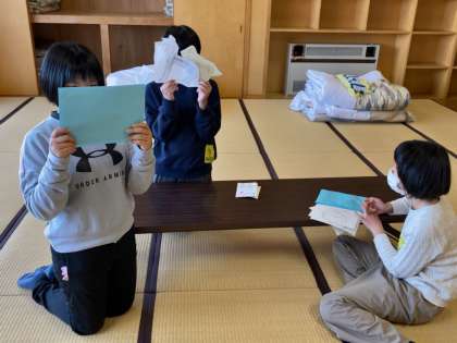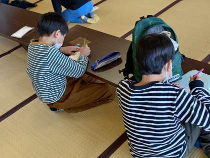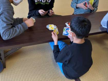 男女部屋ともに、葉書を書いたり、子供会の準備をしたり、カードゲームで遊んだりして過ごしています。