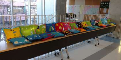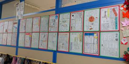 家庭科で作ったクッションと教科「日本語」で調べてまとめた日本の伝統・文化の新聞が掲示されています。
