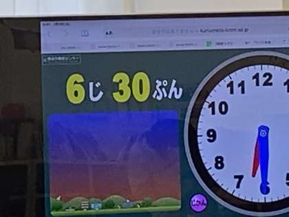 モニターに映し出された時計を見ながら、何時何分なのかを考えます。6時と7時のちょうど真ん中は6時半と6時30分の2通りの言い方があることも知りました。