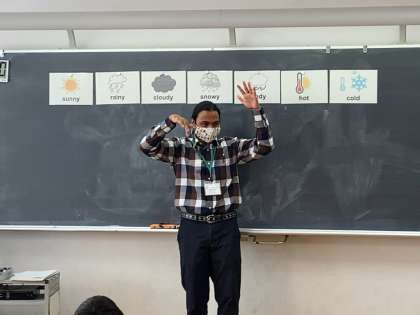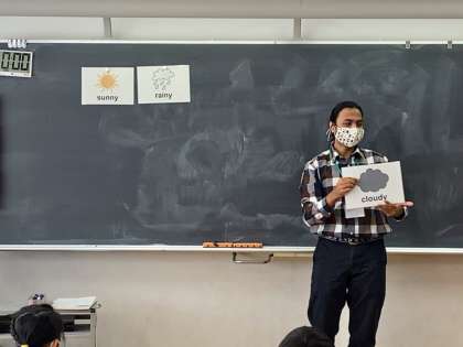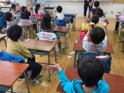 ALTの発音に合わせて、子供たちはテンポ良く発音していきます。言葉だけでなく、それぞれの単語に合わせたジェスチャーを付け、そのジェスチャーをしながら発音練習を繰り返し行なっていました。