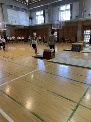 跳び箱の練習では、初めは苦手な気持ちがありましたが、何度も跳ぶうちに4段から5段へと跳べるようになりました。