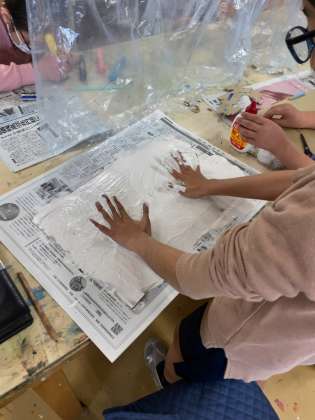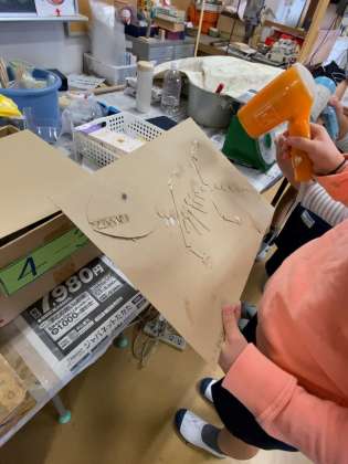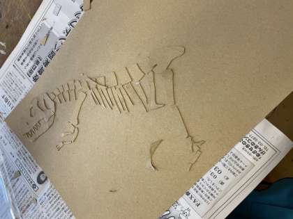 恐竜の骨の形を切り取り、組み合わせて、化石風にしていきます。子供たちは細かい作業にも丁寧に取り組んでいました。また、切り取った形を貼り付けた後には、ドライアーを使って乾かしていました。