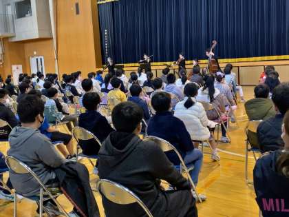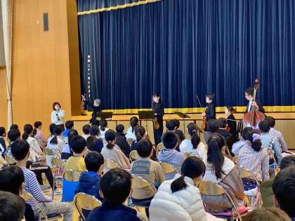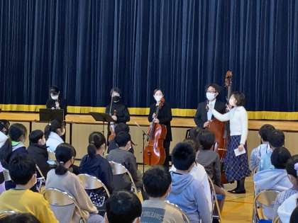 東京フィルハーモニー交響楽団をお招きして、弦楽五重奏の鑑賞をしました。登場した楽器はヴァイオリン・ヴィオラ・チェロ。