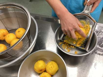 2学期最期の給食は、柚子味噌焼きのセレクト給食です。柚子皮をすりおろすと、給食室が柚子の香りでいっぱいになりました。