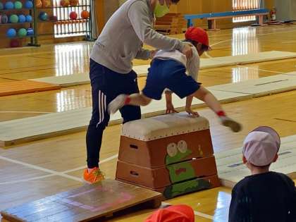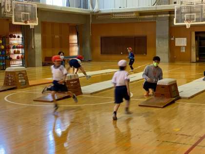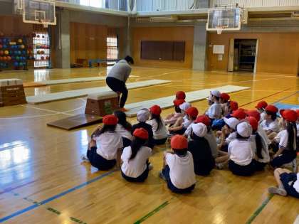 跳び箱の特別授業を1年生の2クラスが行いました。