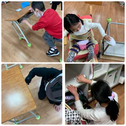 毎日過ごした教室や机・イス、ロッカーなどみんなできれいにしました。汚れているところを見つけてはきれいにし、「ここもきれいにしてもいいですか?」と進んで取り組んでいました。