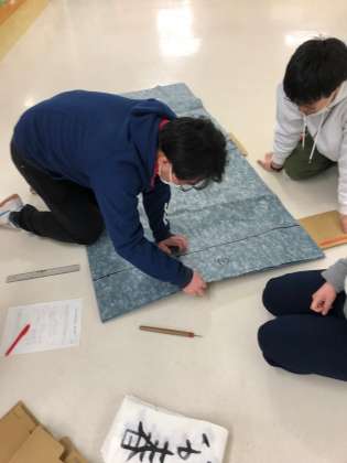 放課後に、子供たちが書いた半紙を掲示するための台紙を準備しました。