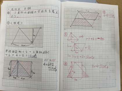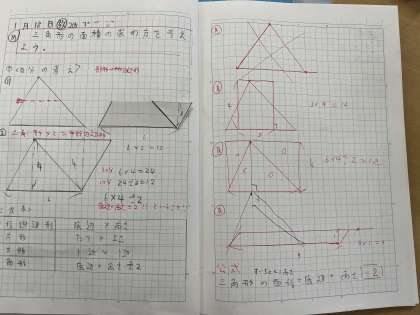 1/19 三角形の面積の求め方 5年生 公開日 2022/01/19 更新日 2022/01/19 できごと 算数で、三角形の面積の求め方を学習しました。 前回までに学んだ平行四辺形や長方形の面積の求め方を使うために、三角形を切ったり移動したりして、より簡単に正確に求めることができました。 時間いっぱいまで自分の考えを熱心に書く人や友達の考えによく耳を傾けノートにまとめている人がとても多くいました。 いいね(0)