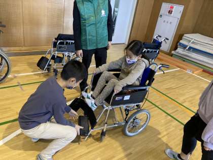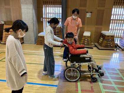 初めに、社会福祉協議会の方々から説明していただき、気を付けることを聞きました。その後、グループに分かれて「車いすに乗る人」「車いすを押す人」「観察者」を交代で体験しました。