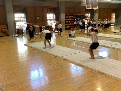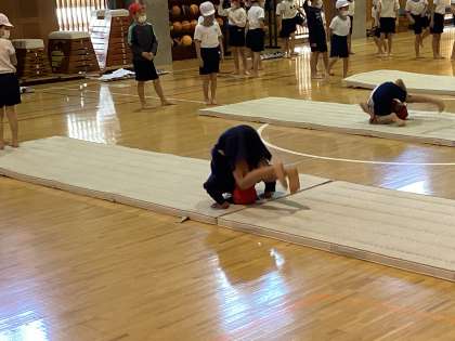 今日は後転の動きに挑戦しましたが、まだ自分の力で後ろに回れない子供たちも先生の補助を受けて回り、後ろに回る感覚を養うべく、何度も繰り返し練習していました。