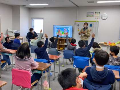くすのき学級の子供たちが元気いっぱいに外国語活動に取り組みました。ALTの先生の問いかけにも素早く反応し、画面に映し出されたいろいろな形と、その形の色を英語で表現しようと頑張っていました。