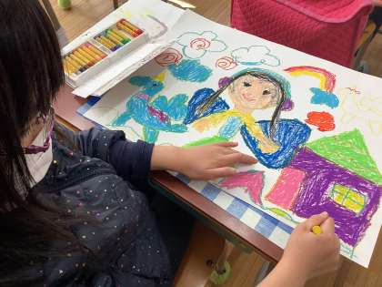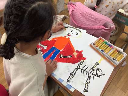 ドラゴンにのって化石を見付けにいきたい、自由に空を飛びたいなど、自分がやってみたいことを想像し、楽しい絵を描いていました。