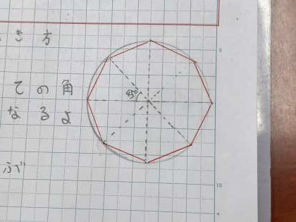 2/7 正多角形と円(算数)5年生 公開日 2022/02/07 更新日 2022/02/07 できごと 正八角形のかき方を考えました。ポイントは八角形は八角形でも、正八角形であるということです。 辺の長さが全て等しく、角の大きさも全て等しい多角形を正多角形といいます。子供たちはその多角形の性質を使って、正八角形を作図していました。 いいね(0)