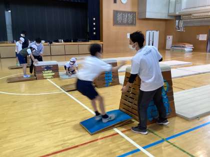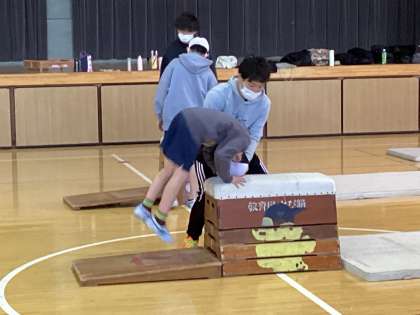 今日は跳び箱特別授業の最終日。2年生の1クラスと4年生の3クラスが特別授業を行いました。4年生は台上前転に挑戦。ゲストティーチャーに補助をしてもらうことで、落下の恐怖が抑えられ、子供たちは勢いよく助走し、踏み切りができるようになってきました。
