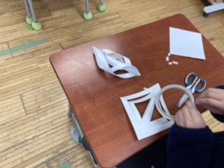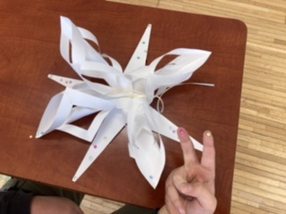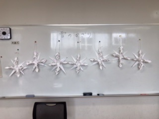 前回から制作していた木の工作が終わった子は、「雪の飾り」を作りました。紙を三角に折ってハサミで切り込みを入れた後両面テープで止めました。4つの筒状の飾りを一つにまとめ、次に長三角の紙も貼り付け、最後にキラキラする飾りを付けて完成です。