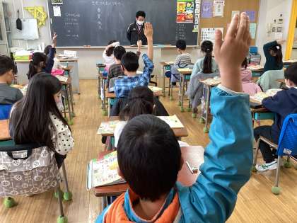 今の季節は冬。子供たちは、お汁粉を売っているお店、お正月の飾り、葉が色付いた後に落ちた様子などを発表し合い、冬の季節を感じていました。