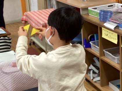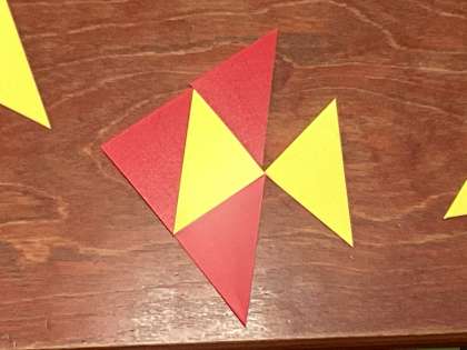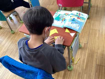 三角の色板を使って、かたちづくりをしました。魚・お花・チョウチョウなど、三角の色板でいろんなかたちを作ることができました。