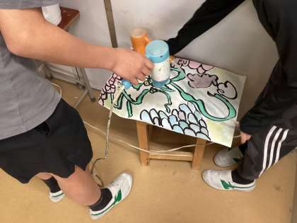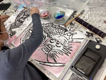 6年生が墨を使って絵を描いています。ペンや絵の具を使って描いた絵とはまた違う感じが墨を使うと出ます。子供たちは大筆や小筆を使い、丁寧に墨で絵を描いていました。絵の具で色を塗った子はドライアーで乾かしていました。