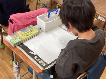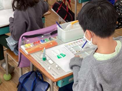 クレパスクレヨンと絵の具を使って,色の水たまりを作ります。白のクレパスクレヨンで水たまりの形を描き,その形の中に水を入れ,絵の具で色を付けていきます。色の水たまりから,どんな世界が広がっていくのか,今後の子供たちの表現が楽しみです。