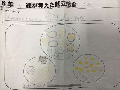 今日の給食は、6年3組の作成献立です。テーマは、「体があたたまるような冬にてきした献立」です。(実際の給食では、栄養士が細かい部分を修正しています)