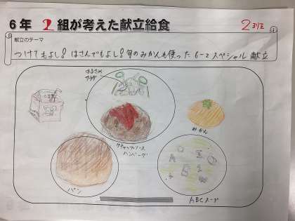 今日の給食は、6年2組の作成献立です。